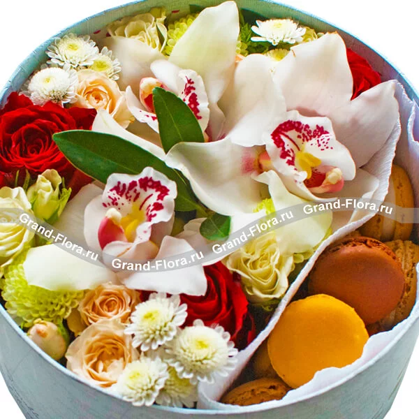 Стандартный (на фото): роза красная - 3 шт., роза кустовая кремовая - 1шт., хризантема белая мелкоцветная - 1 шт., орхидея белая - 3 шт., оазис, макарунс - 8 шт., фетр белый, коробка круглая (20х20см).