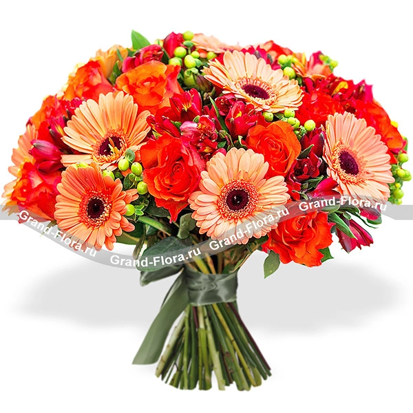 Стандартный: роза оранжевая - 5 шт., гербера оранжевая - 3 шт., альстромерия бордовая - 3 шт., гиперикум - 2 шт.,Упаковка крафт или фетр лента зеленая.