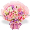 Люкс: роза розовая - 6 шт., роза кустовая розовая - 4 шт., хризантема сантини - 5 шт., статица фиолетовая, статица желтая, упаковка, лента. Примерный размер: 40Х40 см.