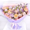 роза кремовая/персиковая – 5 шт., эустома розовая – 5 шт., роза сиреневая кустовая (возможна замена на розовую)– 5 шт., упаковка, лента.